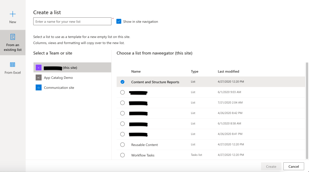 SharePoint Online provides a way to create a List based on another list. But this option is only available when you go to “Site Contents” or /_layouts/15/viewlsts.aspx page and click on “New > List”. It also shows up option to create List based on Excel.
