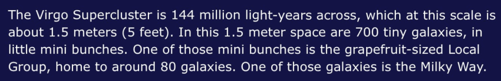 A fun article on Wait But Why explaining the big and small by making it small and big, respectively. Fun fact – our Milky Way is in Virgo Supercluster.