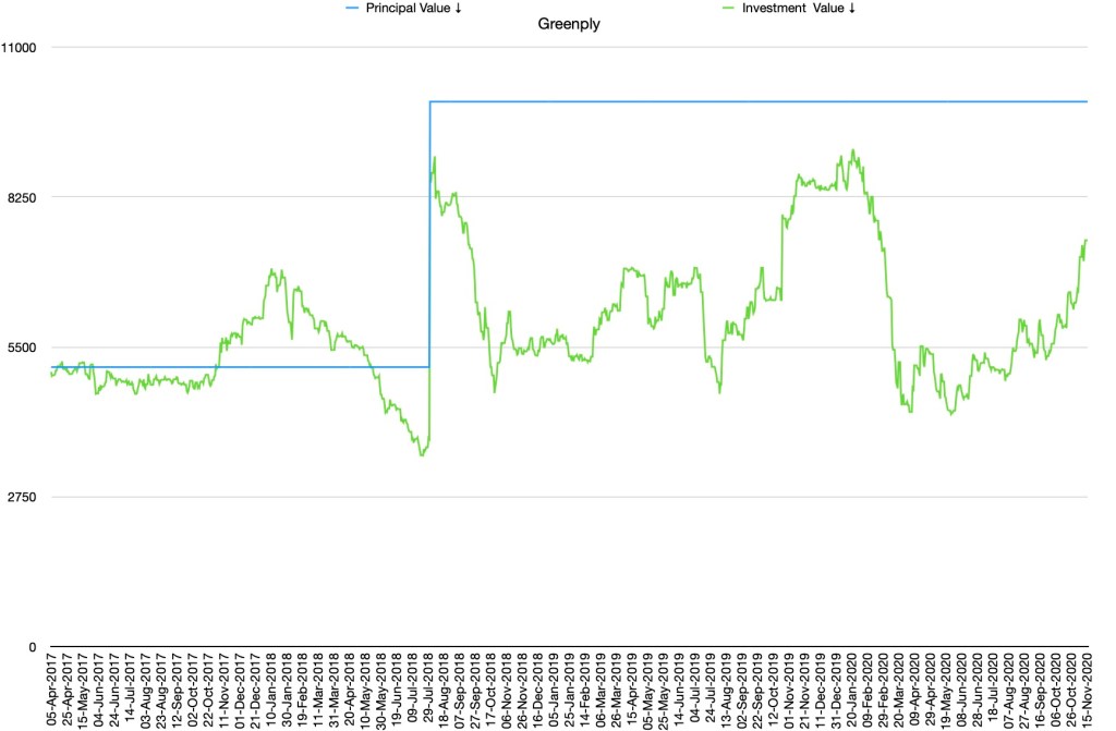 Numbers on Mac provides two very useful functions, STOCK and STOCKH, which return stock price using Yahoo! Finance. You can use STOCKH to fetch historical stock price for a stock, and create chart for tracking historical movements of your investment. All without writing a single line of code. For e.g. here I created historical chart for my investment in Greenply. It’s nothing to brag about but–as you can see–it details out the price movements of my principal and investment value over 3 years.