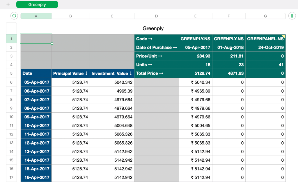 - In the cells E1, F1…, enter the code of stock as per Yahoo! Finance. Greenply demerged its MDF business in Greenpanel in the ratio 1:1 giving me additional 41 shares for zero cost. So you see that in the cell G1.
