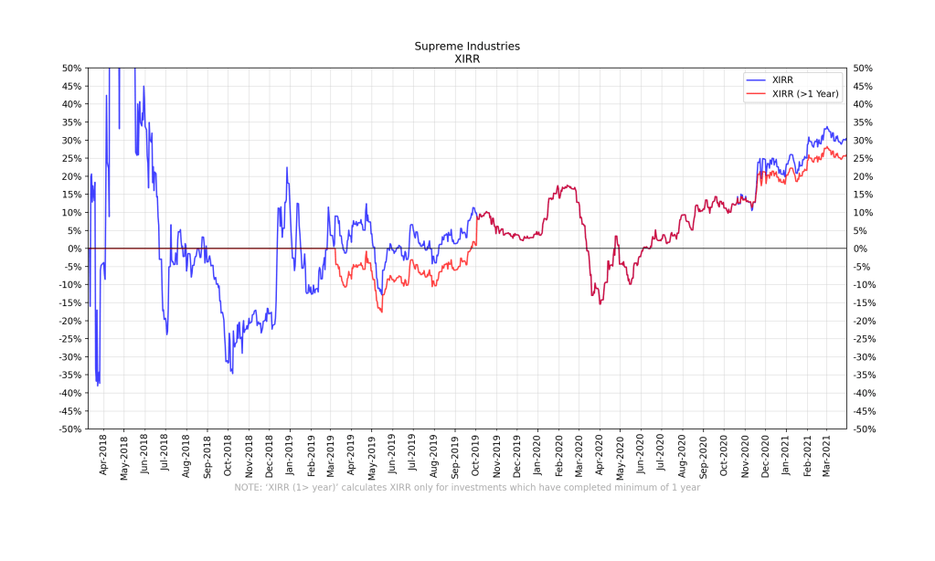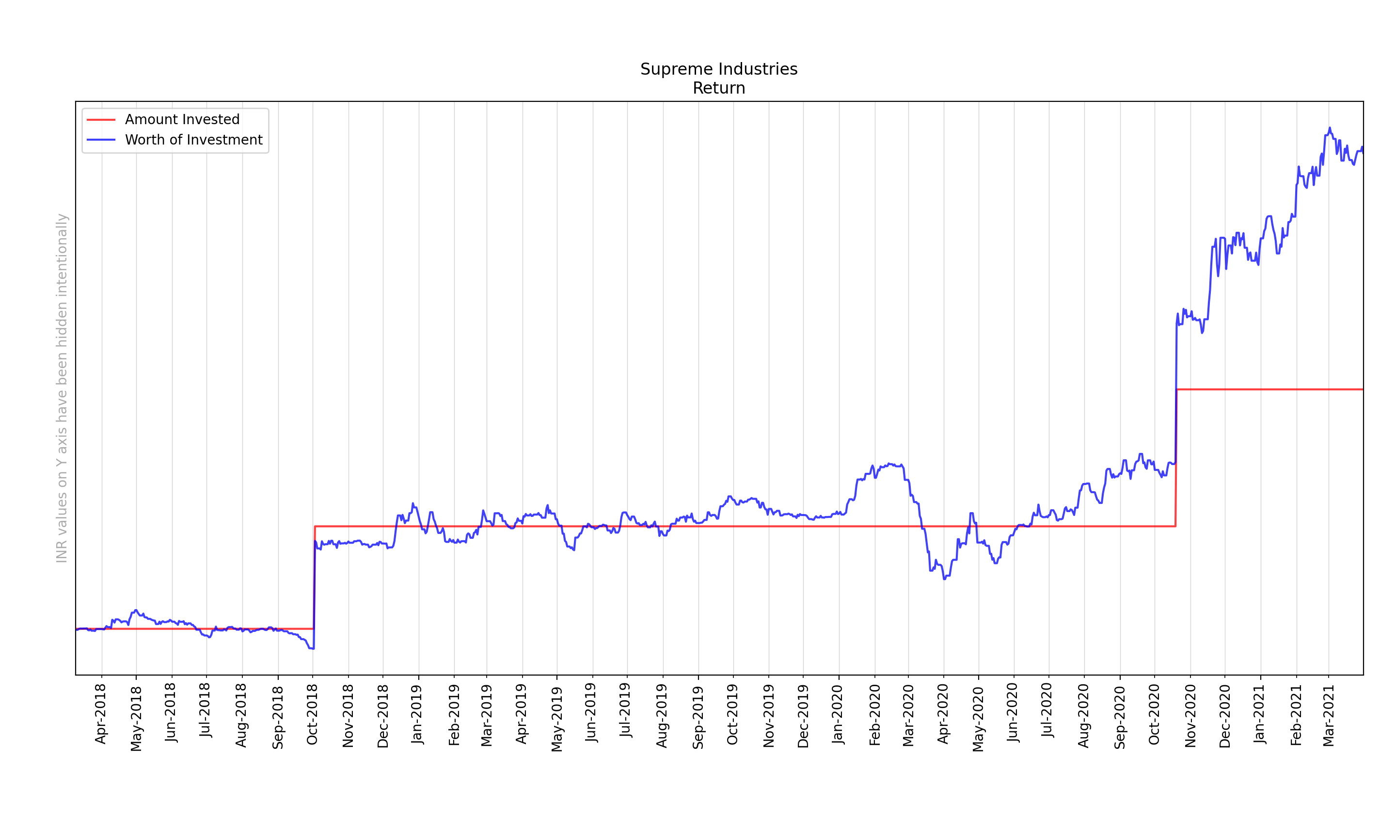 3 years ago I invested in Supreme Industries after my thorough research (I bought a plastic chair made by Supreme Industries and I liked it). After that I invested just two more times in the stock. Below is how the stock has performed for me over these 3 years.