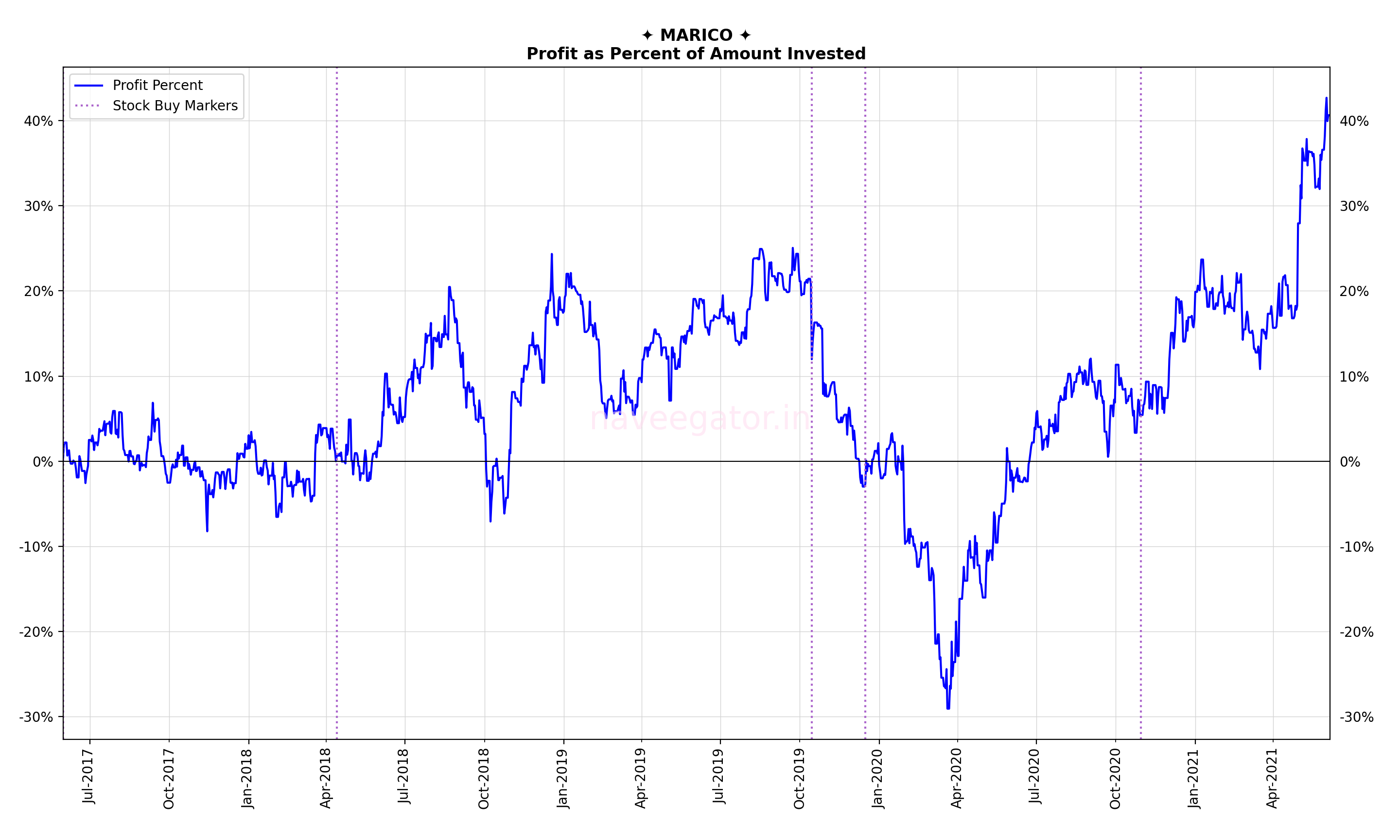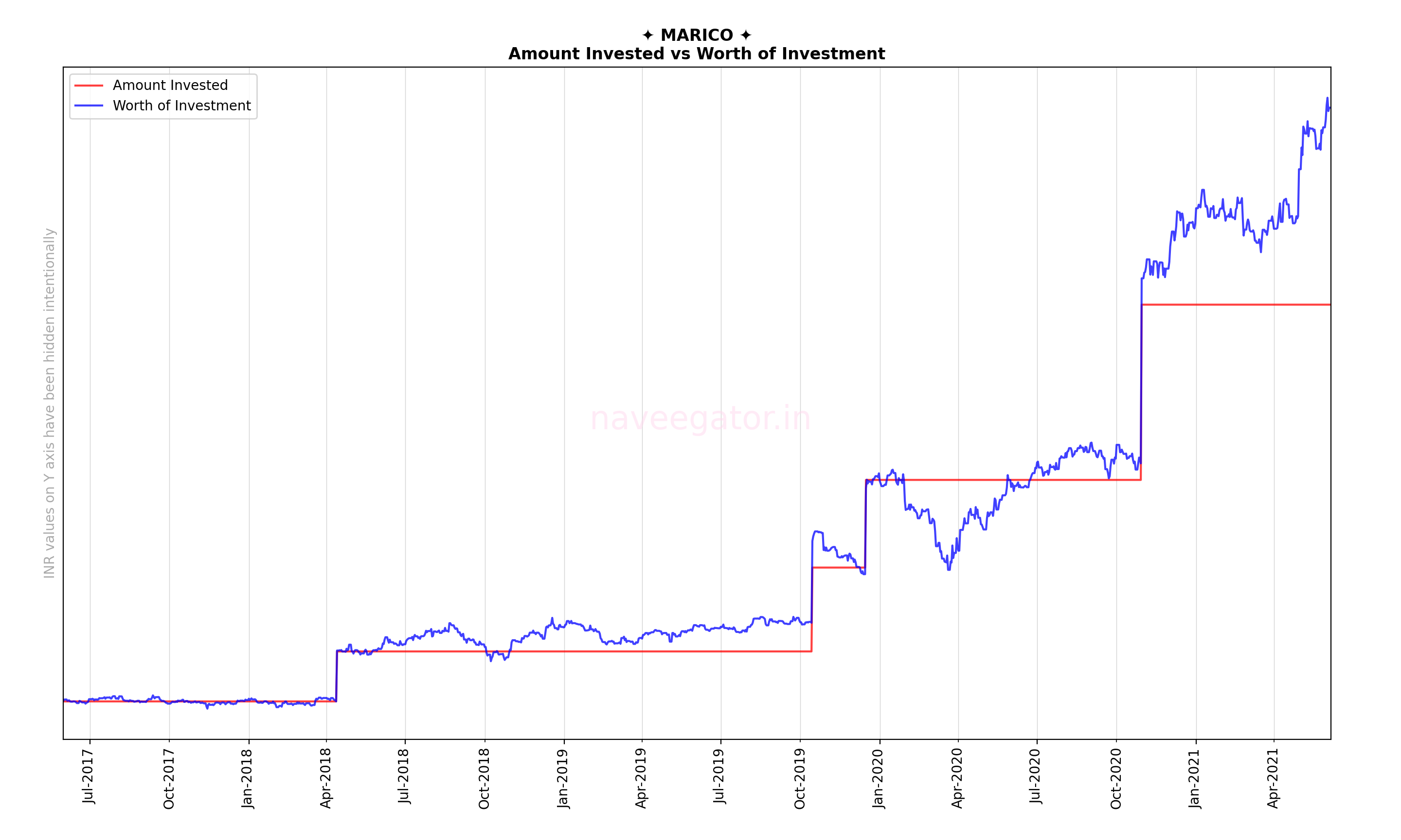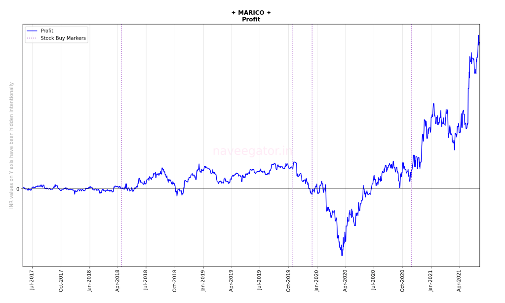 The first year of my investment’s worth was flat with no gains; the second time I bought Marico after one year, it was at the same levels as the first time. But the next three years the share price has been steadily improving (except the COVID pandemic crash).