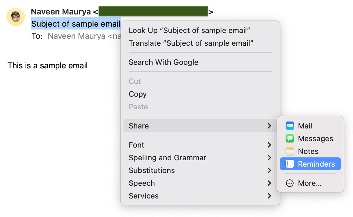 1. In your Apple Mail app select the subject of your email and right click. This is a key step so that the reminder opens up the email that you want to follow up on. Click on Share > Reminders. On iOS you follow the same steps—select the Subject, tap on Share and select the Reminders app.