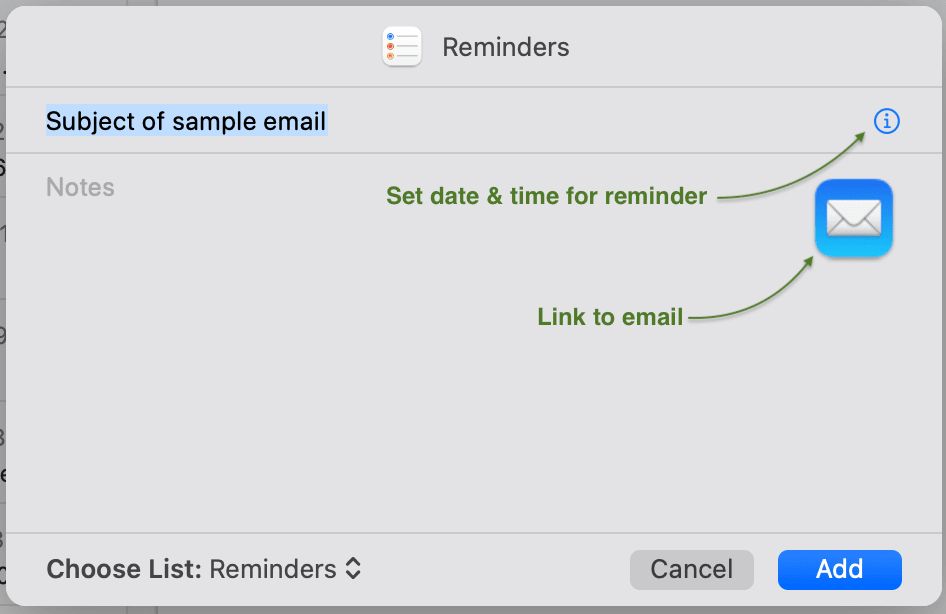 2. You will get a dialog similar the one below where you can set the date and time for reminder. Note the Mail icon being shown in the dialog. Click on the Add button.