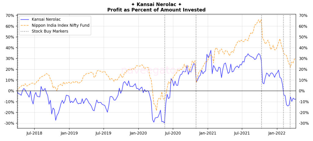 - The company has been barely able to beat Nifty 50 Index fund and since last one year Nifty 50 Index has beaten it by a huge margin. As of today while the returns in Nifty 50 Index fund would have been 25%, Kansai Nerolac’s returns has been at –5%.