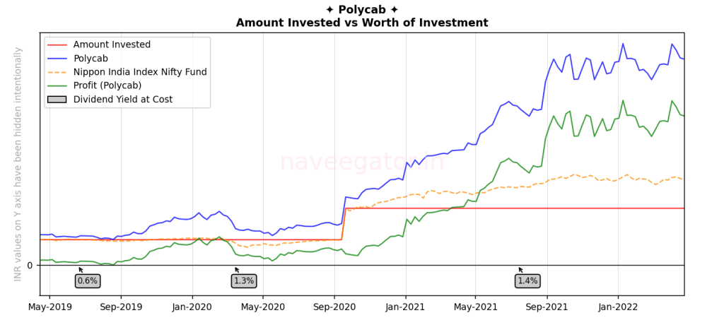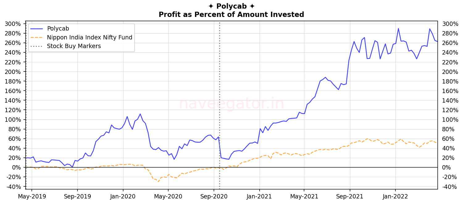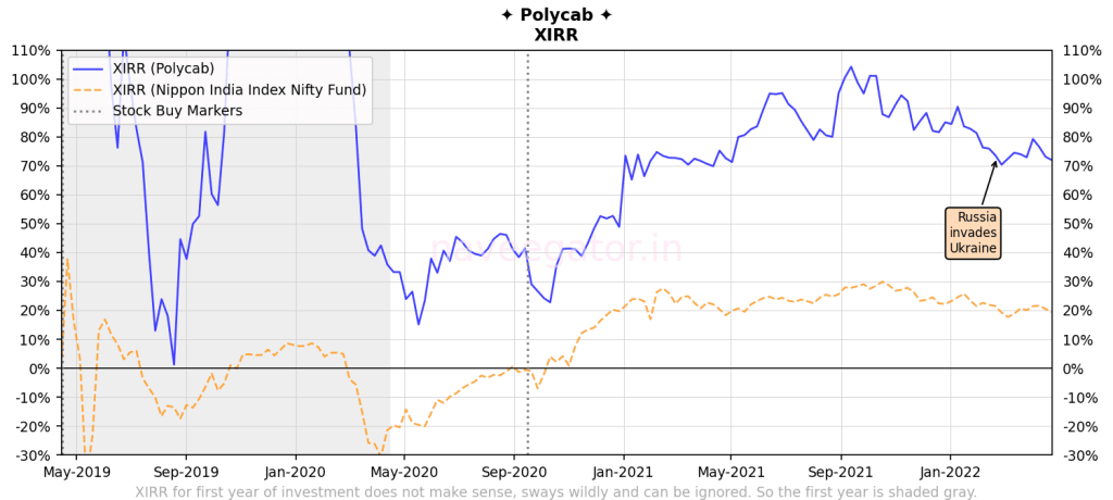 - My investment in Polycab—which is really small—has beaten Nifty 50 Index fund by a huge margin. With Polycab I have XIRR of 70%, while with Nifty 50 Index I would have 20%.