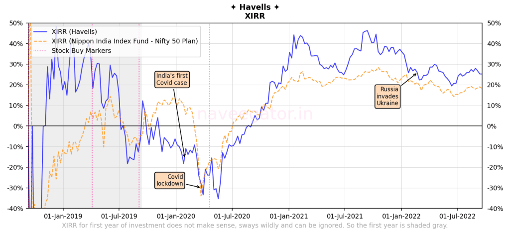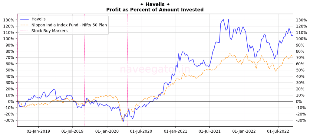 I have been incredibly lucky with my investment in Havells. With 25% XIRR I have beaten the Nifty 50 Index by a comfortable margin. But then it is because of this outperformance I have been a bit hesitant to invest more in this stock. I have not invested in this stock since last two years and the share price’s sideways movement has meant that the outperformance over Nifty 50 Index has shrunk over the last year.