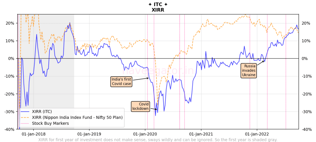 Last year when I wrote about ITC, I mentioned that there are die hard fans of ITC who are waiting for its resurrection some day. I think that day is here. Since Feb-2022, ITC has consistently moved up and as of today it is beating Nifty 50 Index after five years.