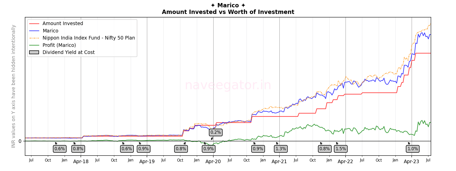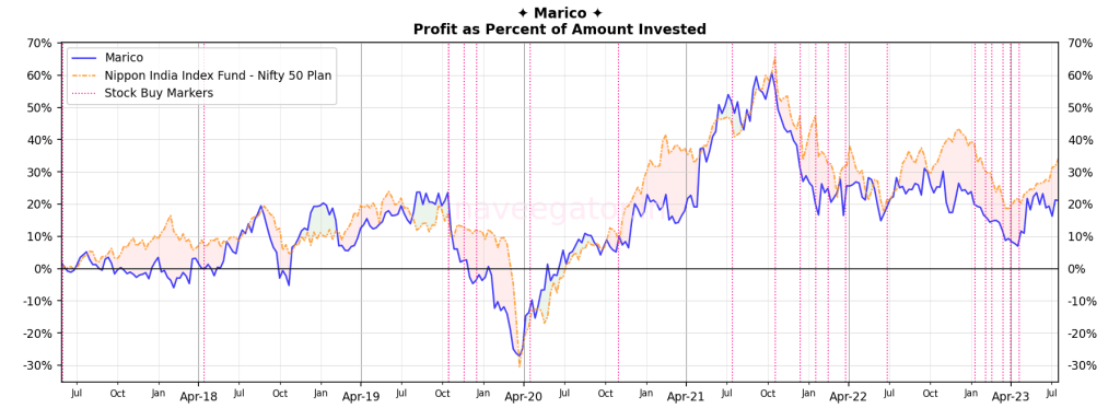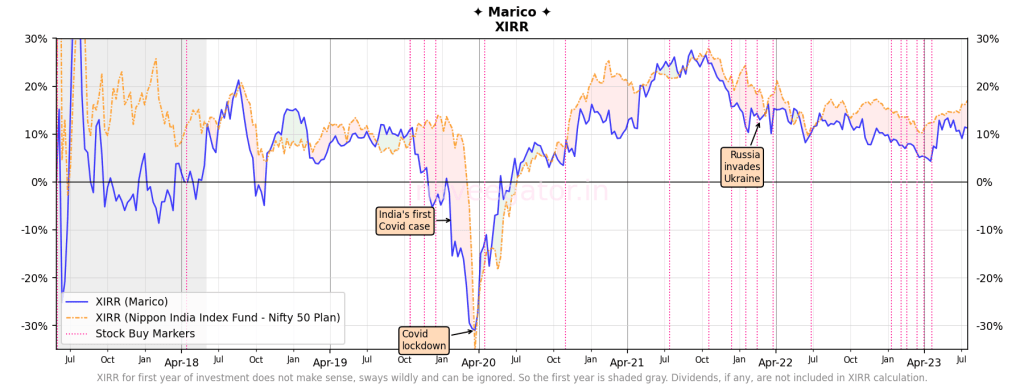 In my six years of investment with Marico, there have few sporadic periods where my investment has beaten Nifty 50 Index; majority of the times it has underperformed. For my consolation, I even tried calculating XIRR including the dividends, still no.