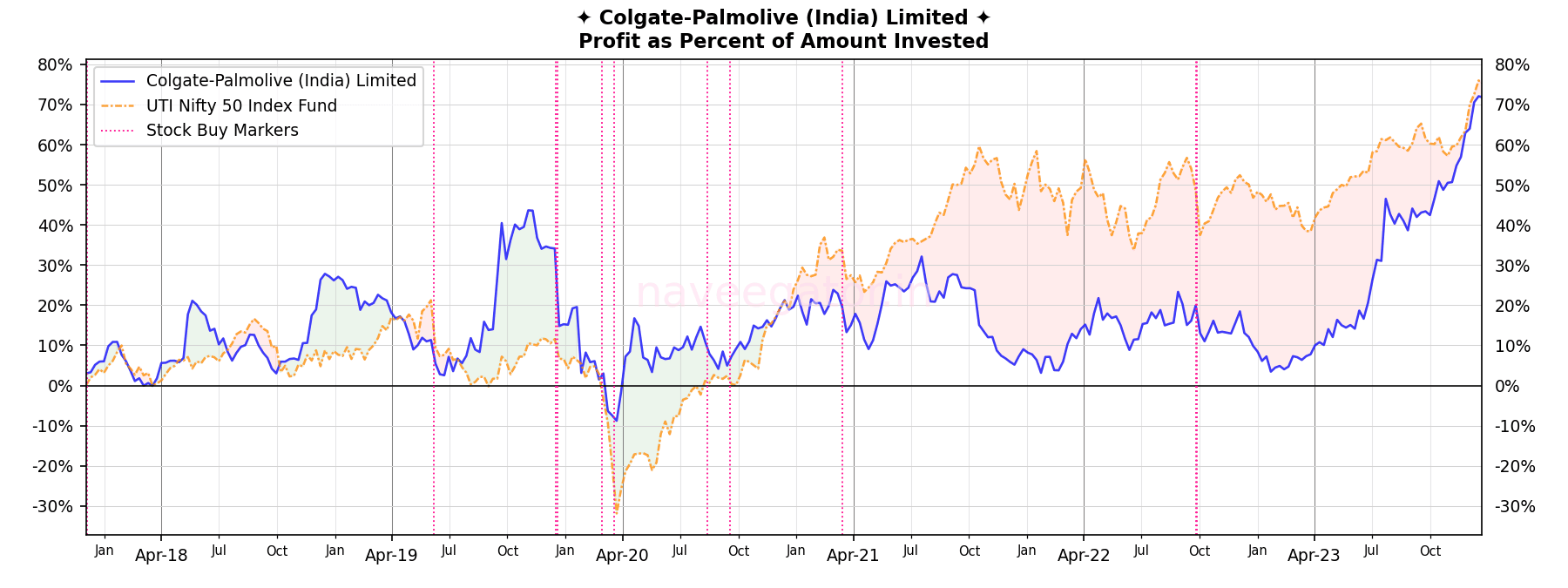 My conviction has paid off this year. From the beginning of the year, Colgate has experienced a steady upward trend, with a remarkable increase of over 65%. Following three years of lagging behind the Nifty 50 Index, my investment in Colgate has now successfully bridged the gap. Given the current momentum, I am confident that it will outperform the Nifty 50 Index in the coming year. Additionally, the dividends have proven to be satisfactory.