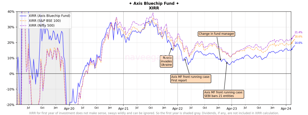 My journey with Axis Bluechip Fund completed five years and it was the year where I decided to call it a pause on the investment. Its continued underperformance against its benchmark S&P BSE 100 was the primary reason to take a pause. And to some extent the Axis front running case was also responsible for my decision.