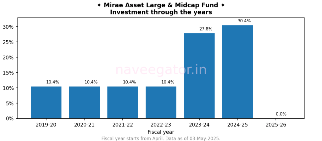 In Oct’23, when Mirae Asset increased the SIP cap, I didn’t waste time. I started a new SIP in the direct plan to benefit from the lower expense ratio, while continuing the old SIP in the regular plan. That’s why you’ll see a noticeable increase in my investment from FY 2023–24 (see Figure 1). Just a month later, in Nov’23, the fund was renamed to Mirae Asset Large & Midcap Fund.