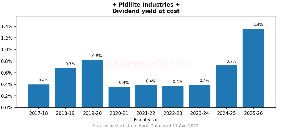 The dividend yield at cost (Figure 3) has been nothing home to write about. But this year—FY 2025-26—Pidilite announced a special dividend owing to which I saw a dividend yield at cost of more than 1%.