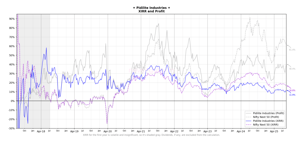 Pidilite has been an outperformer since I started investing in it eight years ago (Figure 2). I am yet to see negative returns on it—not even during the Covid market crash. However, after nearly six years of outperforming the Nifty Next 50 index, my luck ran out in October 2023. The Nifty Next 50 surpassed my returns and, as of today, it is still outperforming.