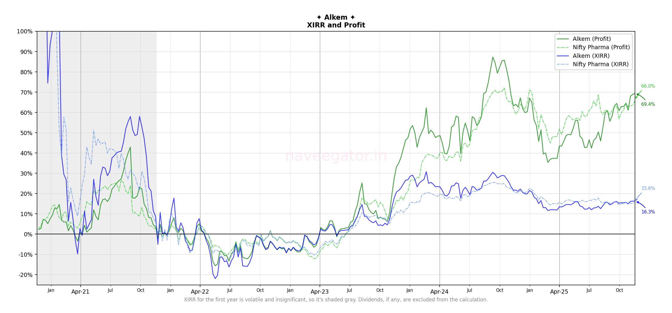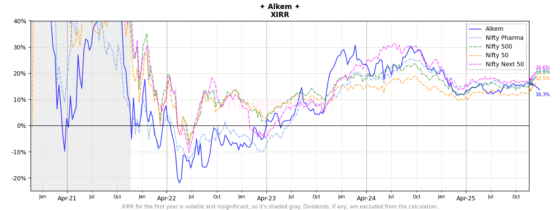 Comparing it to a broader range of indices—Nifty Pharma, Nifty 500, Nifty 50, Nifty Next 50—reveals a new detail (Figure 4). The initial years had significant deviations between the returns of Alkem and the indices. In the last one year they are all merging into a small range of 12-16% XIRR.
