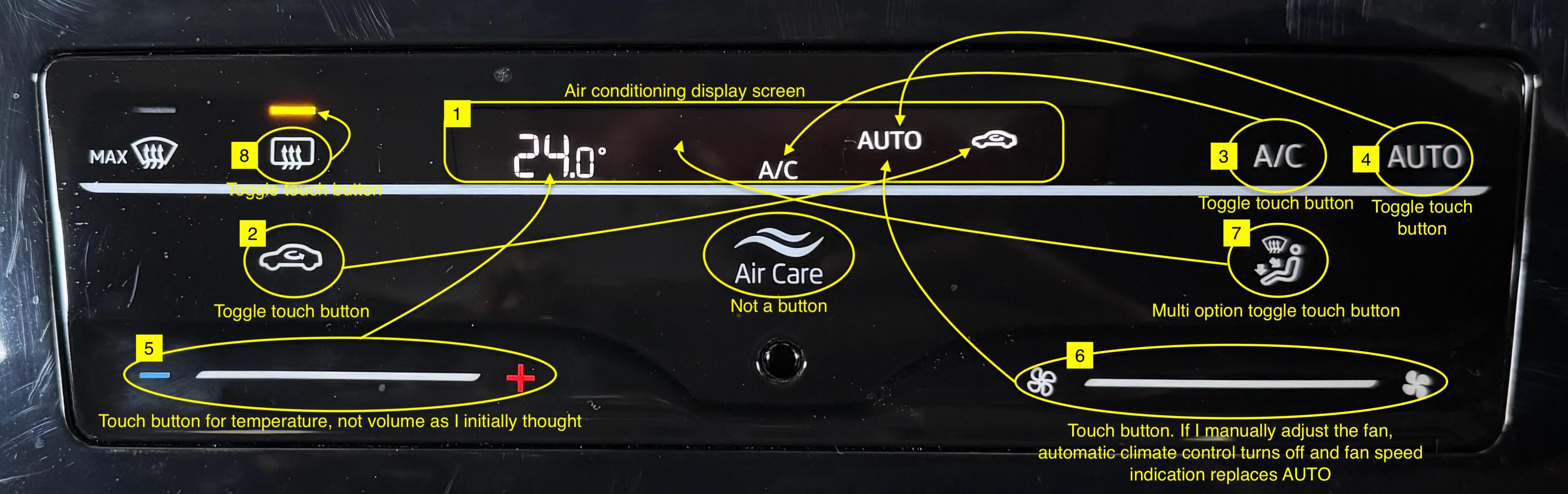 But the touch button to set the direction of the air outlet (#7) is a multi option button with 4 options. Each touch enables the next option but I haven’t memorised all the options and their order. So cycle through them twice to find my option but the first time I am just getting the order. In the analog days a knob was used here and I understand its usability—and importance—now.