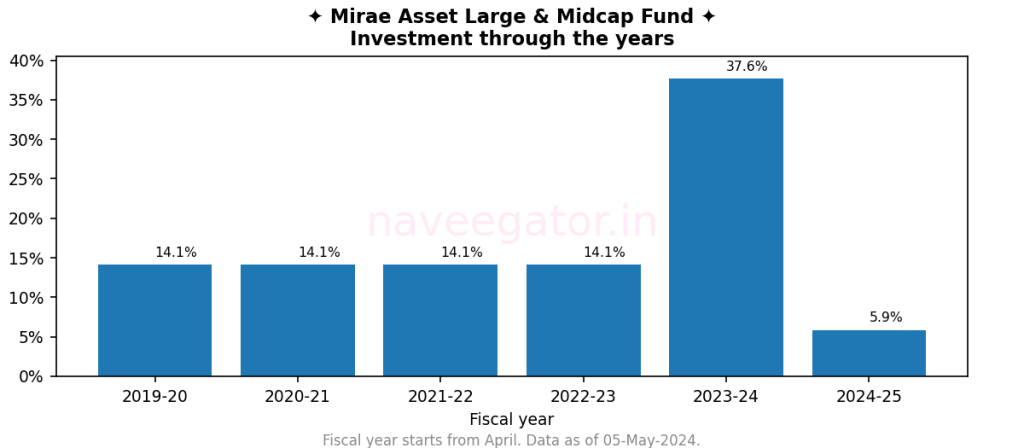 In Oct’23, when Mirae Asset increased the SIP cap, I didn’t waste time. I started a new SIP in the direct plan to benefit from the lower expense ratio, while continuing the old SIP in the regular plan. That’s why you’ll see a noticeable increase in my investment from FY 2023–24 (see Figure 1). Just a month later, in Nov’23, the fund was renamed to Mirae Asset Large & Midcap Fund.
