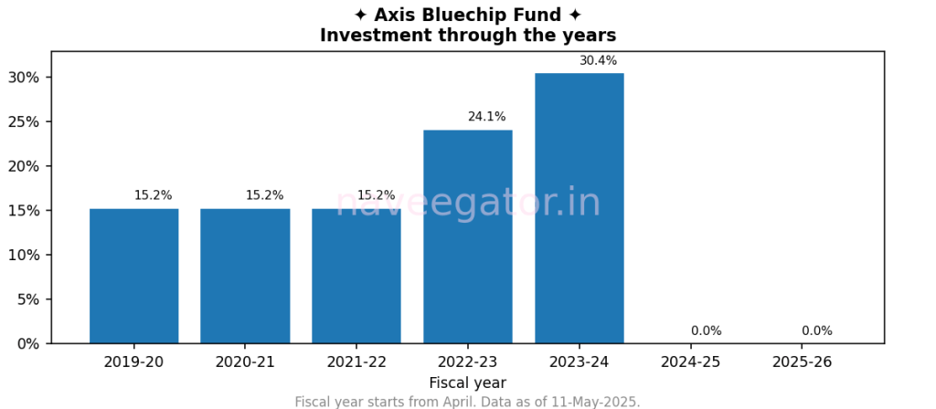 I have stayed with Axis Bluechip Fund for five years starting FY 2019-20. In Sep’22, I decided to increase my SIP. However, this time, I opted for the direct plan to reduce the expense ratio. As a result, this analysis includes investments made through both the regular and direct plans. You can see the uptick in my investments since FY 2022-23 in Figure 1.